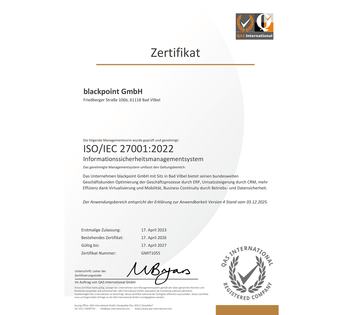 Die blackpoint GmbH hat erfolgreich die Zertifizierung nach ISO 27001:2022 erlangt. Dieses international anerkannte Informationssicherheitsmanagementsystem (ISMS) stellt sicher, dass blackpoint die höchsten Standards in Bezug auf die Sicherheit von Informationen und Daten einhält.